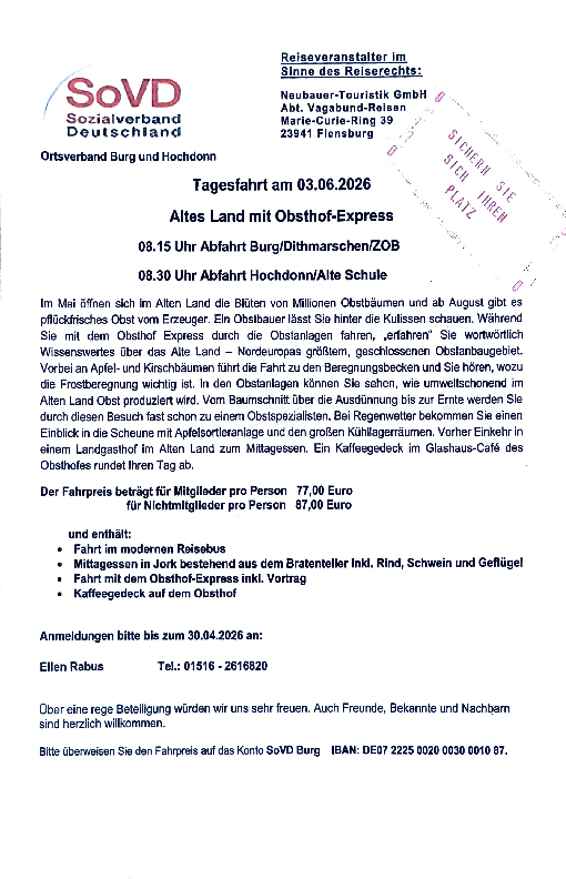 Der direkte Draht zum SoVD vor Ort für unsere Mitglieder und alle Interessierten! Unter dem Motto "Gemeinsam statt einsam" treffen wir uns im Ortsverband Albersdorf zu sozialpolitischen Informationsveranstaltungen, interessanten Vorträgen, gemütlichen Runden und Feiern, Tages- und Mehrtagesfahrten und vielem mehr.