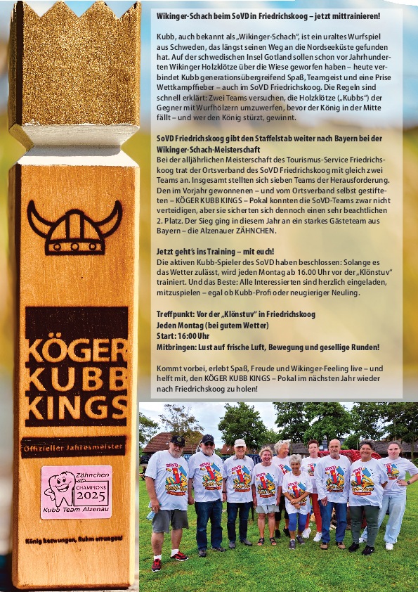 Der Höhepunkt war die Teilnahme an der Norddeutschen Wikingerschachmeisterschaft für Mannschaften in Friedrichskoog. Die Teilnehmer des Sozialverbands traten mit großer Begeisterung und Ehrgeiz gegen andere Teams aus der Region an. Das Ziel des Spiels ist es, die Holzklötze des gegnerischen Teams mit Wurfhölzern umzuwerfen und letztendlich den König zu stürzen. Dabei ist strategisches Denken und präzises Werfen gefragt.