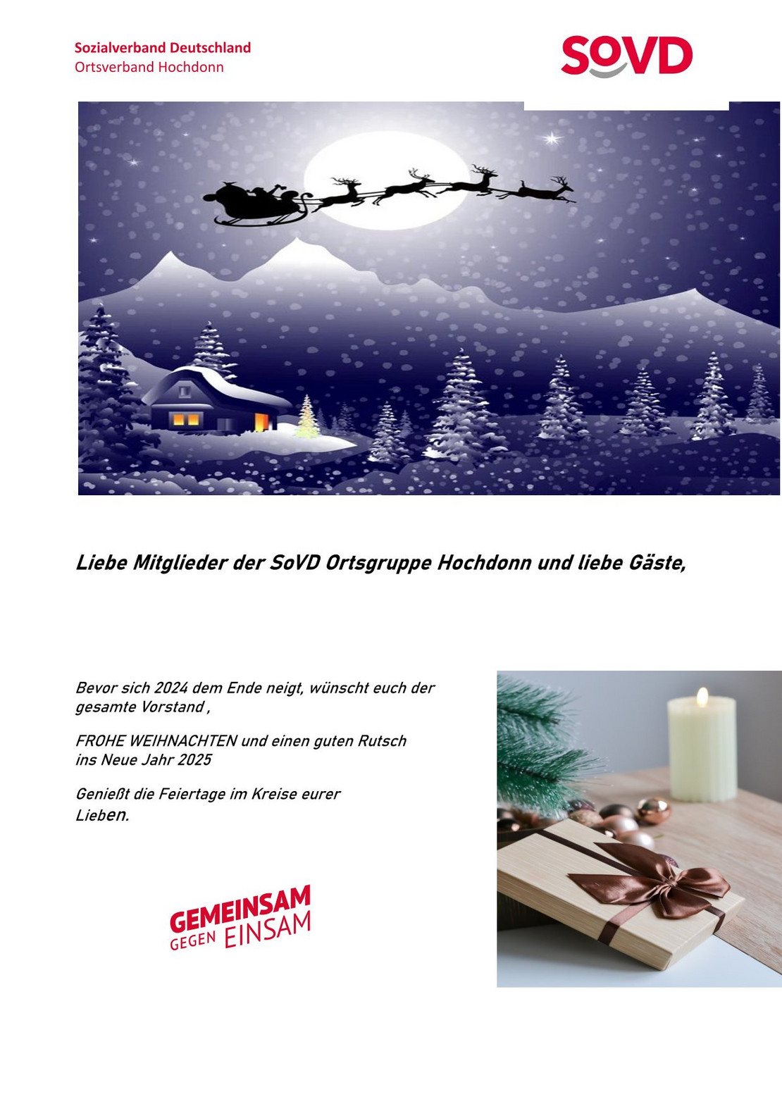 Als Anlauf- und Kontaktstelle für Mitglieder und für Interessierte bieten wir in ehrenamtlicher Regie regelmäßige Zusammenkünfte, Informationsveranstaltungen mit sozialpolitischem Inhalt, allgemeine Vorträge, gemütliche Runden und Feiern, Tages- und Mehrtagesfahrten und noch einiges mehr an. Das Motto unseres Ortsverbandes in Hochdonn lautet „gemeinsam statt einsam“.