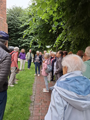 Eine kleine Gruppe des SoVD Ortsverband Lunden machte eine Tagestour zum Hospiz in Meldorf, der Museumsweberei Meldorf sowie ins Café “Feld und Flur“ in Hövede. Gerade der Besuch des Hospizes war für den ein und anderen mit viel Respekt und vielen Fragen behaftet. Was würde uns da wohl erwarten. Diese und ähnliche Fragen stellten sich die Teilnehmer im Vorfeld. Einige Mitglieder wollten gerne mitfahren, hatten aber zu viel Ehrfurcht vor dem Hospiz. Alle, die bei diesem Besuch dabei waren, erlebten unerwartet ein Haus mit einem besonderen Charakter, einen Ort der Geborgenheit, der Menschlichkeit, der Stille aber auch des Lachens. Hier kümmern sich besondere Menschen um ihre „Gäste in ihrer letzten Lebensphase“. Das Haus wirkt mehr wie ein Hotel. Nichts erinnert an Krankenhaus oder Tod. Es ist hell und freundlich. Das Personal ist bestens geschult und steht jederzeit Menschen zur Seite, sei es im Hospiz oder im ambulanten Hospizdienst. Der Freundeskreis Hospiz Dithmarschen bietet Hilfen im Umgang mit Sterben, Tod und Trauer. Ehrenamtlich tätige Menschen sind das Rückgrat des Hauses und Vereins. Noch ganz beeindruckt und nachdenklich besuchte die Gruppe die Museumsweberei und erfuhr in einer Führung, wie besonders diese alten Webstühle sind und diese auch nach 100 Jahren noch hervorragende Arbeit leisten. Die alten Muster sind auch heute noch beliebt und werden genutzt. Die Stadtführerin Frau Hemke zeigte der Gruppe die Besonderheiten rund um den Dom und anschließend im Dom. Die Teilnehmer konnten auch selbst aktiv werden. Anhand von Bildern wurden besondere Darstellungen, Bilder oder Gegenstände usw. im Dom gesucht und meist auch gefunden. Gerade das machte viel Spaß und die anschließenden Erklärungen durch Frau Hemke waren großartig. Der Meldorfer Dom birgt viele Geheimnisse, einige haben wir bei diesem Besuch erfahren dürfen. Anschließend fuhr uns der Bus zum Kaffee trinken nach Hövede. Hier konnten sich alle bei Kaffee und tollem selbstgebackenem Kuchen stärken. Nach einem Besuch im angeschlossenem Landladen mit vielen selbstgemachten Produkten ging es zurück nach Lunden.