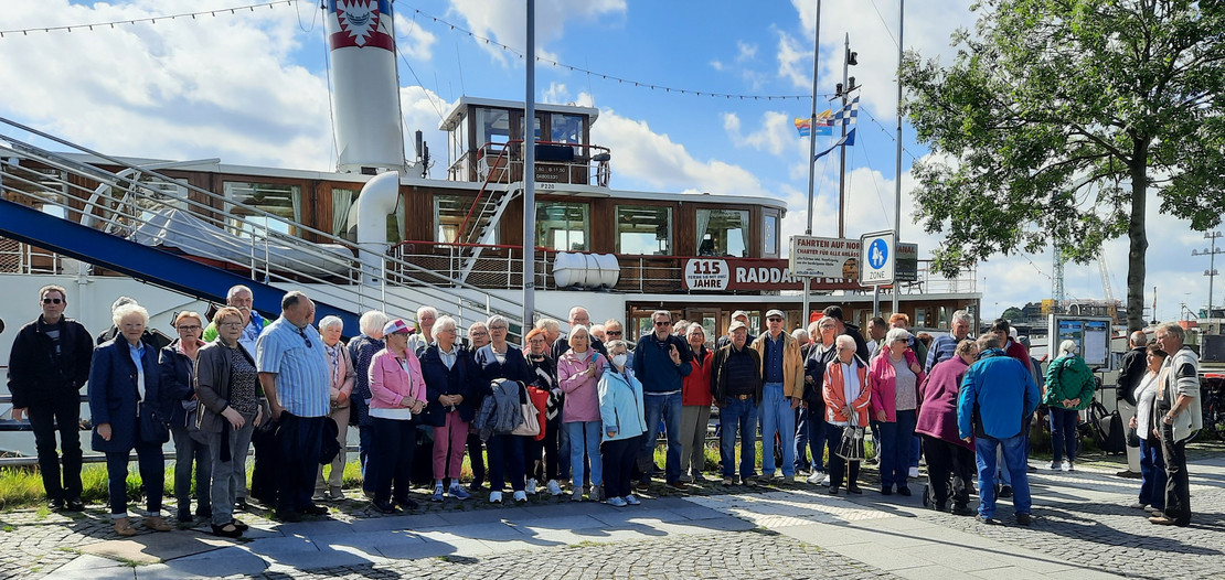 Bei schönstem Sommerwetter startete der SoVD OV Lunden am Montag, dem 8. Juli mit dem Bus vom Reisedienst Breiholz aus Lehe und 44 Teilnehmern zu einer großartigen Tagesreise von Brunsbüttel nach Rendsburg. In Brunsbüttel erwartete uns der Raddampfer „Freya“. Dieser historische Raddampfer verzaubert die Fahrgäste mit seinem einzigartigen Ambiente. Die „Freya“ ist ein noch original betriebener Seitenraddampfer, dessen Zischen und Stampfen, sowie der Blick durch ein verglastes Schaufenster auf die rotierenden Maschinen und Schaufeln für eine ganz besondere Atmosphäre sorgen. Im September 1905 wurde die „Freya“ vom Stapel gelassen. Da hieß sie noch „Westerschelde“. Sie diente unteranderem als königliche Yacht für Königin Wilhelmina der Niederlande, als Dieselbunkerschiff im Weltkrieg, sowie als schwimmender Kaufladen und als Charterschiff. Im Jahr 1999 erwarb die Reederei Adler Schiffe den Raddampfer. Am 8.7. legte die „Freya“ in Brunsbüttel mit 192 Passagieren an Bord ab und los ging eine einzigartige Reise mit vielen Informationen zum Nord-Ostsee-Kanal, den vielen Schiffen, die den Weg kreuzten, einige davon riesengroß, einer tollen Crew und einem hervorragendem Kalt-Warmen Buffet. Die Teilnehmer genossen die Fahrt, das Essen, die vielen Gespräche, die Sonne und die frische Brise. Nach 5 Stunden wurde das Ziel Rendsburg erreicht, wo unser Bus uns schon erwartete und nach Lunden zurückbrachte. Im kommenden Jahr wollen wir dann den Nord-Ostsee Kanal von Rendsburg bis Kiel erkunden, wenn möglich wieder mit der „Freya“.