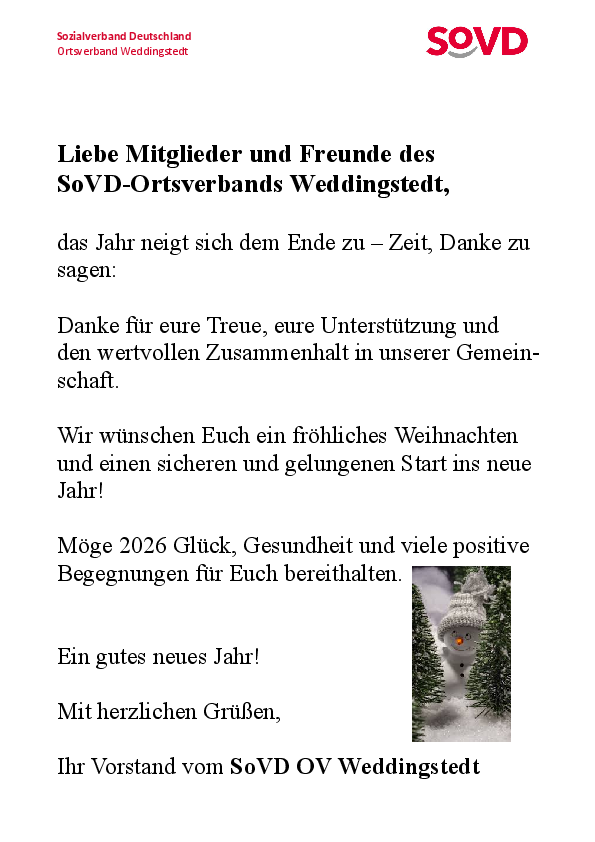 Auch der Dank an die zahlreichen Helferinnen und Helfer, die sich das ganze Jahr über für die Belange der Mitglieder einsetzen, durfte nicht fehlen. Zum Abschluss, nach dem Essen, wünschte der Vorstand allen Mitgliedern ein frohes Weihnachtsfest, sowie Gesundheit und Zuversicht für das kommende Jahr. Die Weihnachtsfeier unterstrich einmal mehr die wichtige soziale Rolle des SoVD-Ortsverbandes als Ort der Begegnung und des Miteinanders - ganz im Sinne des SoVD Mottos „Gemeinsam statt Einsam“.