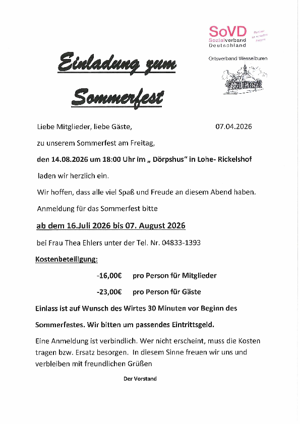 Vor Kurzem fand das Sommerfest des örtlichen Sozialverbands Deutschland (SoVD) im Dörpshus in Lohe-Rickeslhof statt. Die Mitglieder und Gäste wurden im voll besetzten Saal herzlich vom Vorsitzenden Olaf Petersen begrüßt, er freute sich über die große Resonanz und wies noch auf die kommenden Veranstaltungen im Hebbelhaus in Wesselburen hin: den Bingoabend und zwei Weihnachtsfeiern. Die Anwesenden ließen sich den leckeren Spießbraten mit ganz vielen Beilagen schmecken. Es fanden nette Gespräche statt, und für Unterhaltung war auch gesorgt. Am Ende der Veranstaltung war man sich einig, dass es ein schöner Abend war.